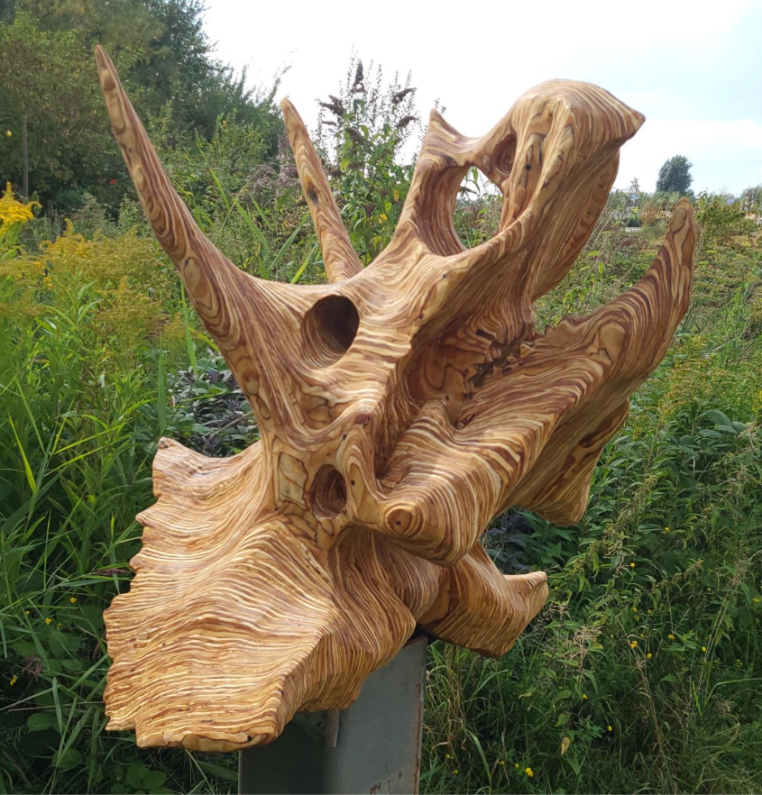 Handgemaakte sculptuur van Triceratops-schedel door Nelle Noordhuis, te zien en de BiedtPlek.